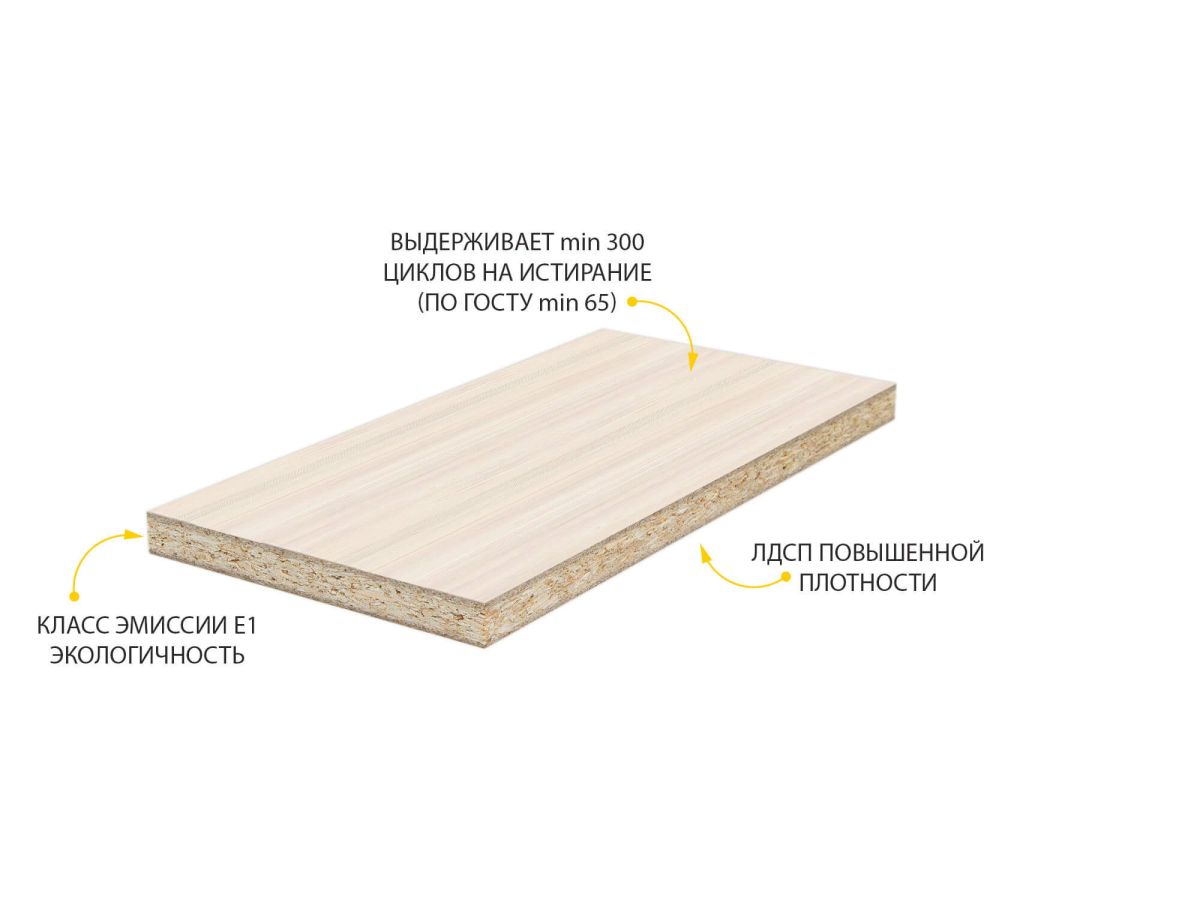 - ЛДСП выдерживает min 300 циклов на истирание, что почти в 5 раз больше, чем требуется по ГОСТу (min 65).