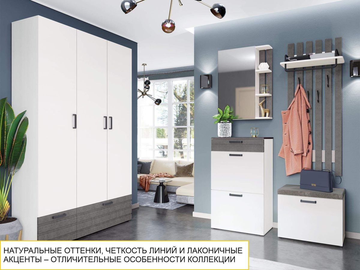 - Трендовое сочетание белоснежного цвета и фактуры серого бетона позволит визуально расширить пространство и сделать интерьер Вашей прихожей стильным.