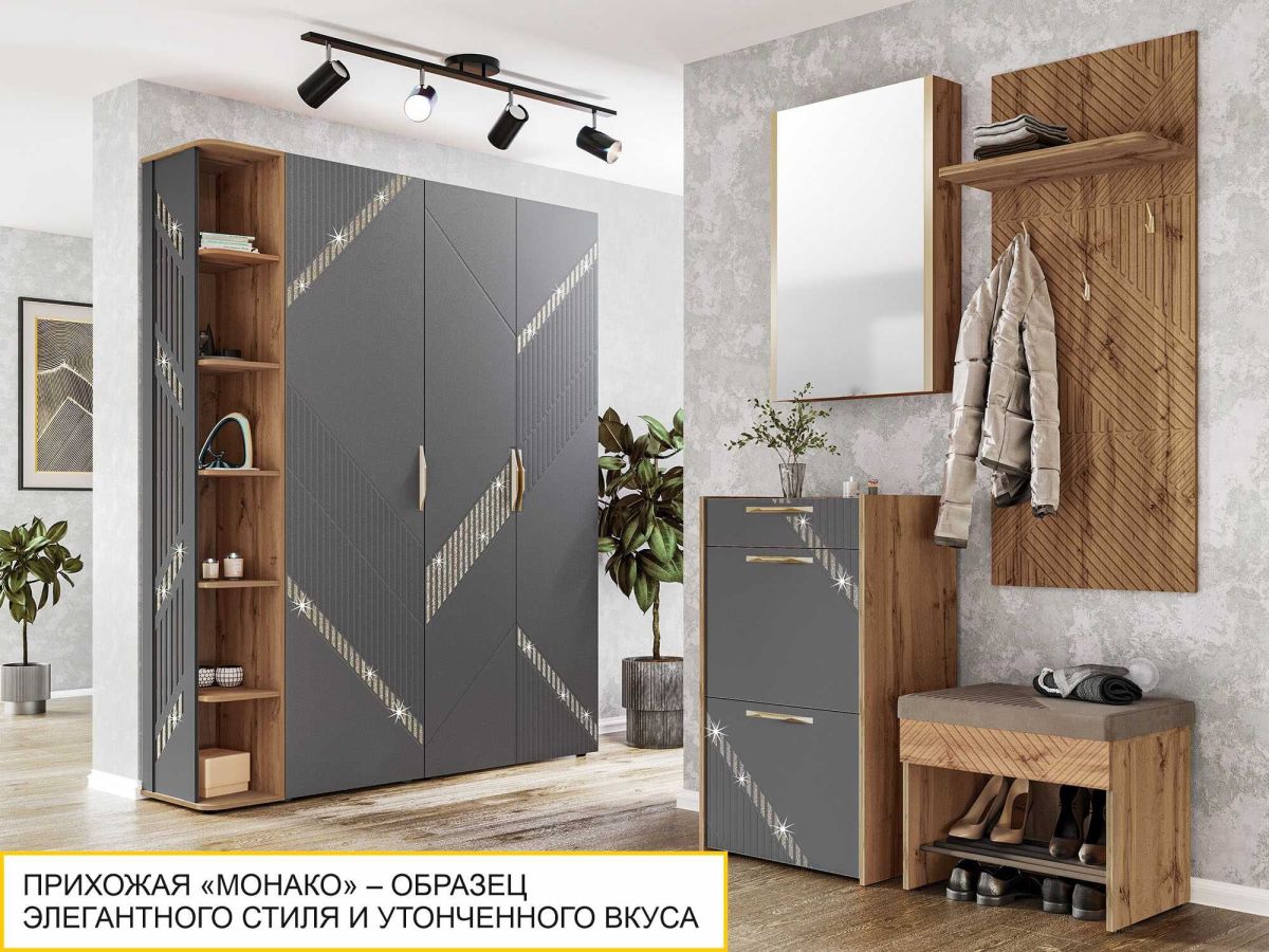 Зеркало с полками «Монако 402.17» является частью модульной серии «Монако». «Монако 402» – образец элегантного стиля и утонченного вкуса. Сочетание матовой графитовой поверхности фасадов с благородной древесной текстурой «Дуб Вотан» создает особую атмосферу гармонии и комфорта.
